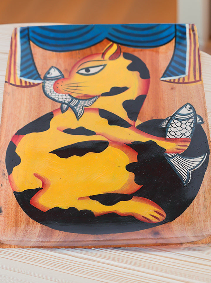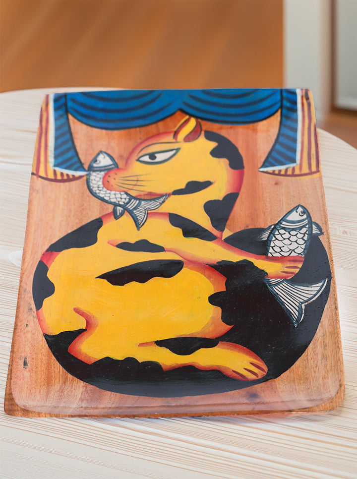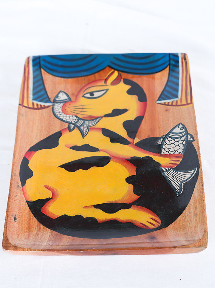 Celebrate artistry with this unique Cat Design Wooden Decorative hanging piece, hand painted by folk artist of Bengal. Featuring a striking hand-painted depiction of a cat holding a fish, this piece blends functionality with traditional Pattachitra art. The rich, vibrant colors and intricate detailing make it a perfect statement piece for your home decor. Ideal for serving or as a display item, this wooden tray is a thoughtful gift for art enthusiasts and cat lovers alike.