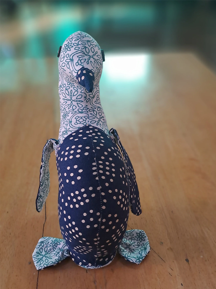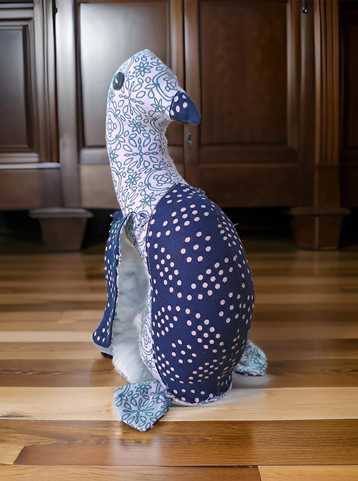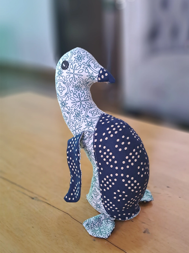 This handmade cloth duck toy is a charming and eco-friendly piece, likely crafted from upcycled fabric.