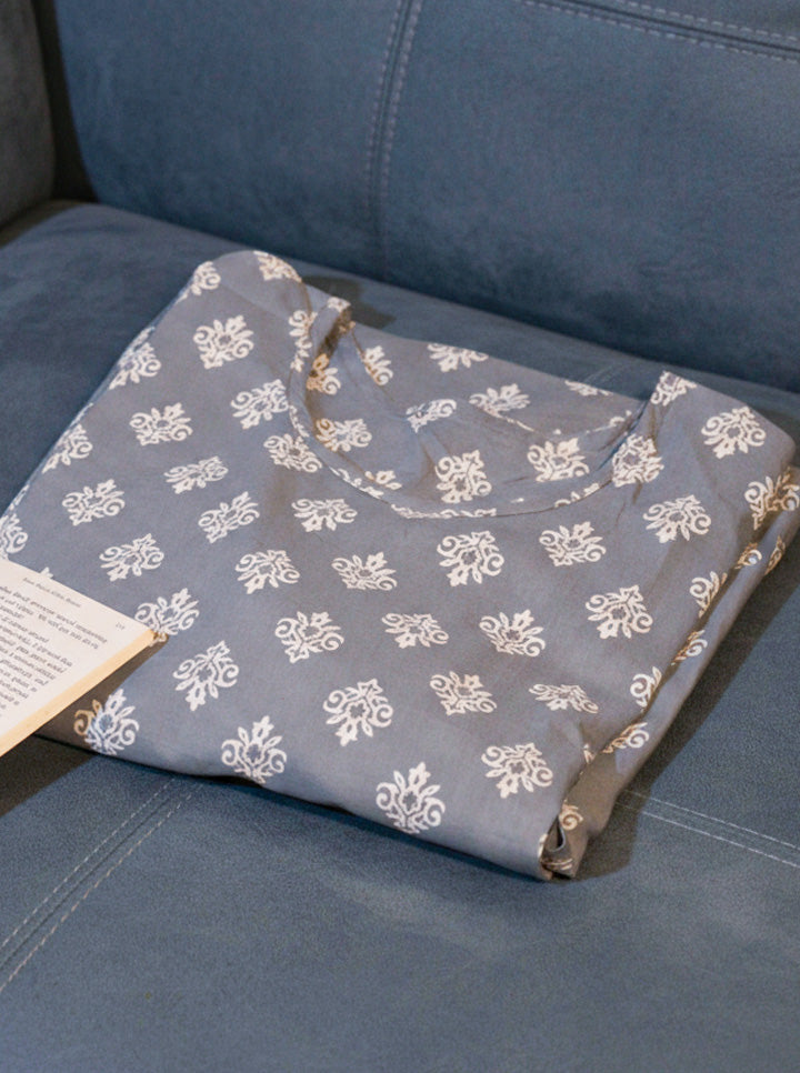 Stay effortlessly elegant with this soft grey kurti, beautifully detailed with white Mughal-inspired block prints. The soothing grey tone adds a calm, minimalist charm, while the lightweight fabric ensures day-long comfort.