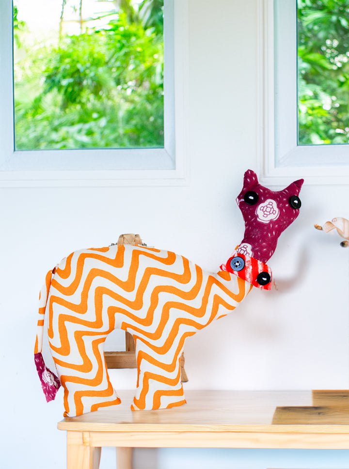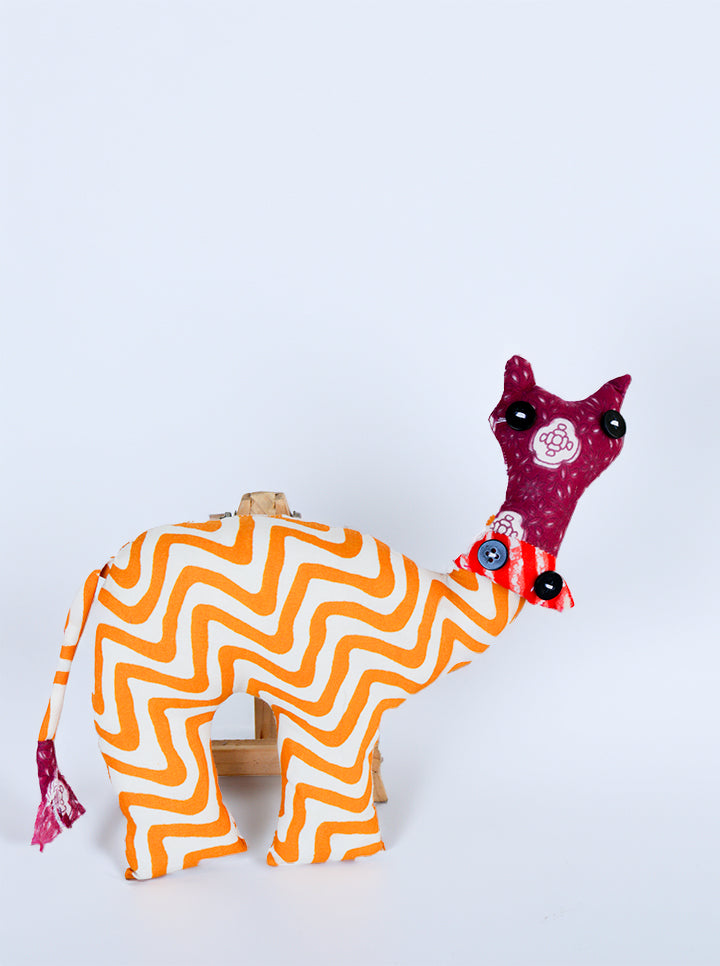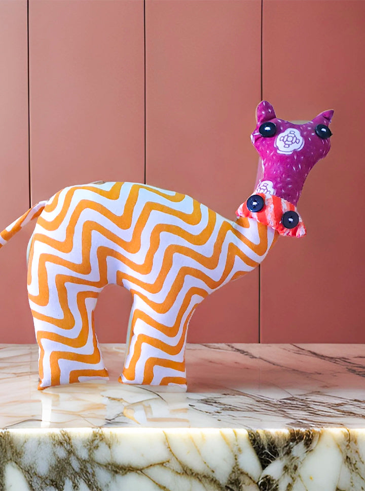 This handmade cloth toy resembles a stylized cow with a vibrant and artistic design. The use of patterned fabric, button eyes, and stitched details gives it a unique, handcrafted appeal. It could be a great decorative piece or a soft toy for children.
