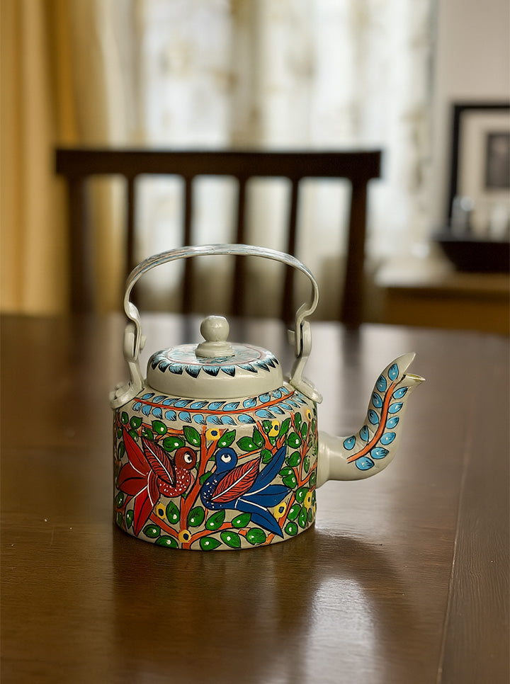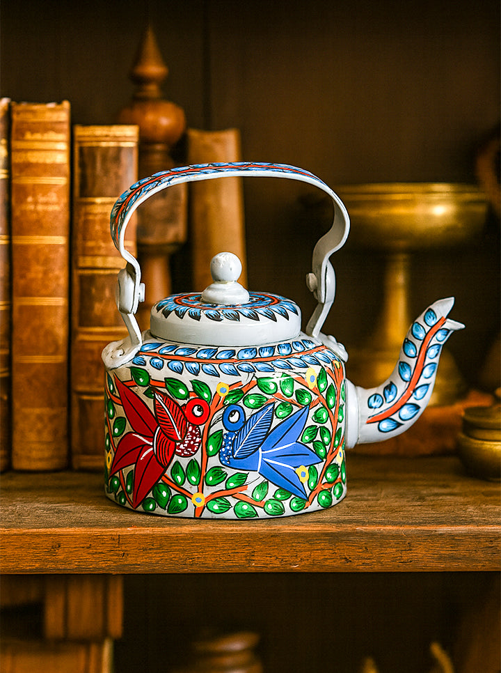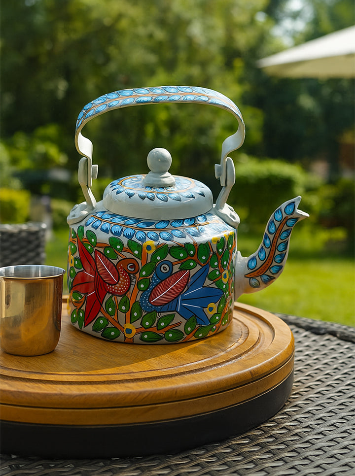 Enhance your tea-time experience with this beautifully Hand-Painted Aluminum Kettle, a masterpiece of craftsmanship and tradition. Adorned with intricate designs and vibrant colors, this kettle is perfect for both functional use and as a unique décor piece.