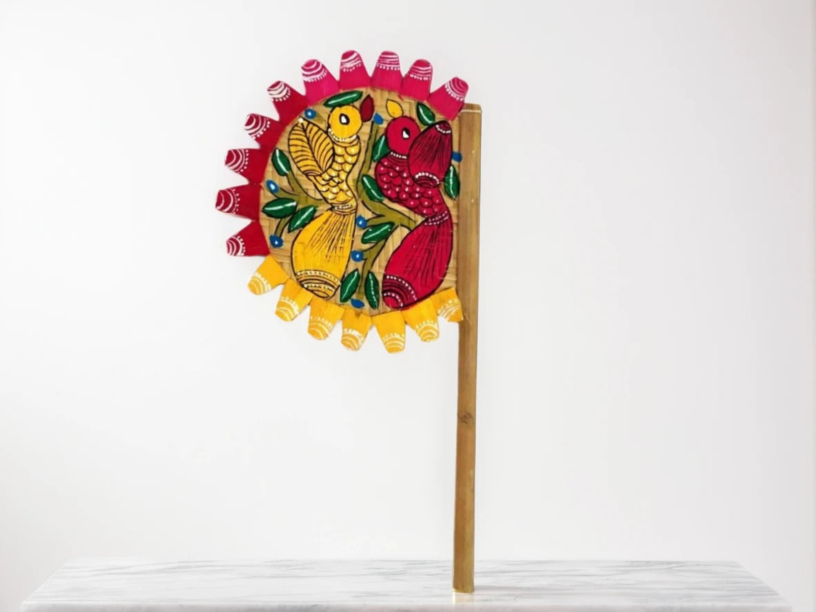 Hand-Painted Bamboo Hand Fan – Pattachitra Bird Art (Yellow And Red )