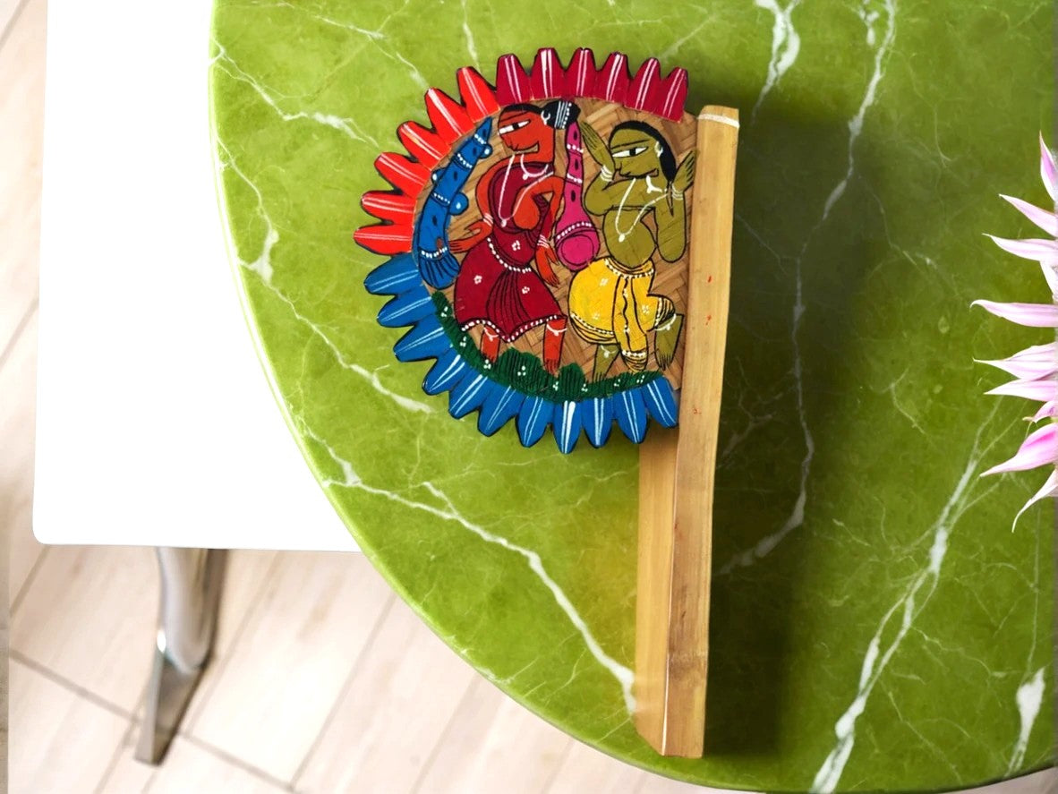 Experience the charm of Indian craftsmanship with this exquisite hand-painted bamboo hand fan. Adorned with intricate Pattachitra folk art, this fan showcases a beautiful traditional motif, adding a touch of culture and elegance to your collection.