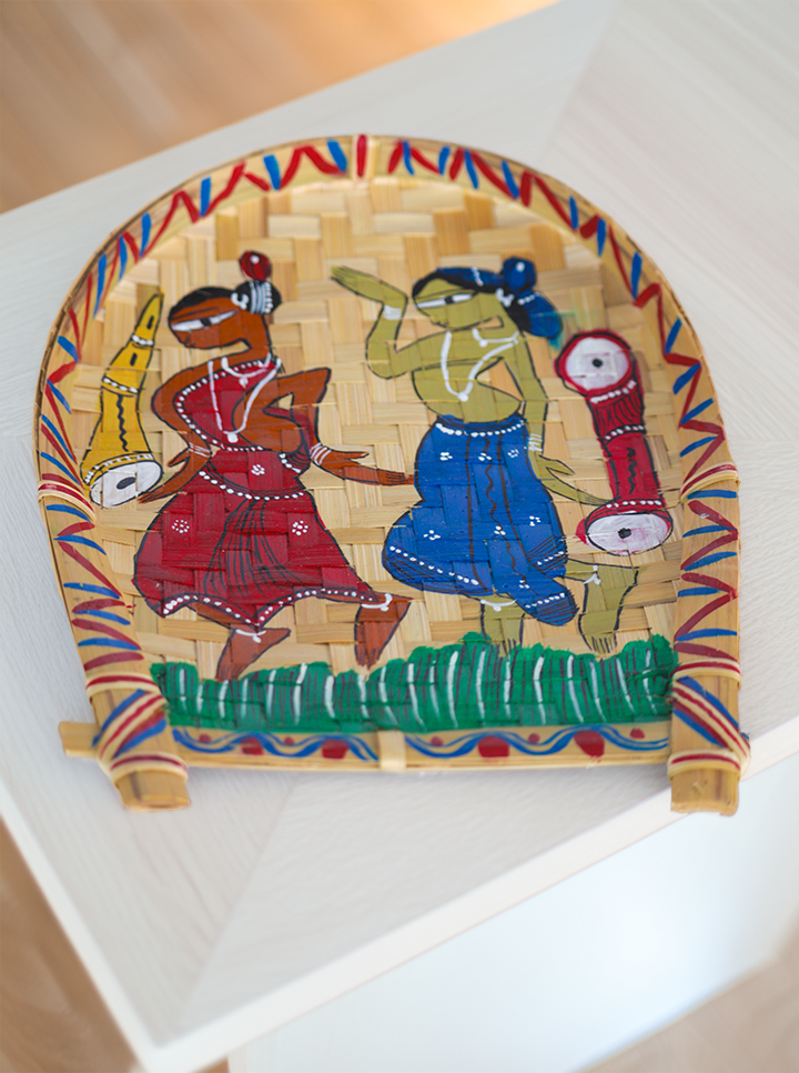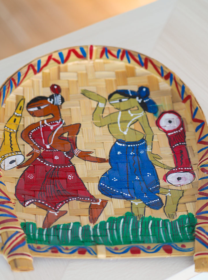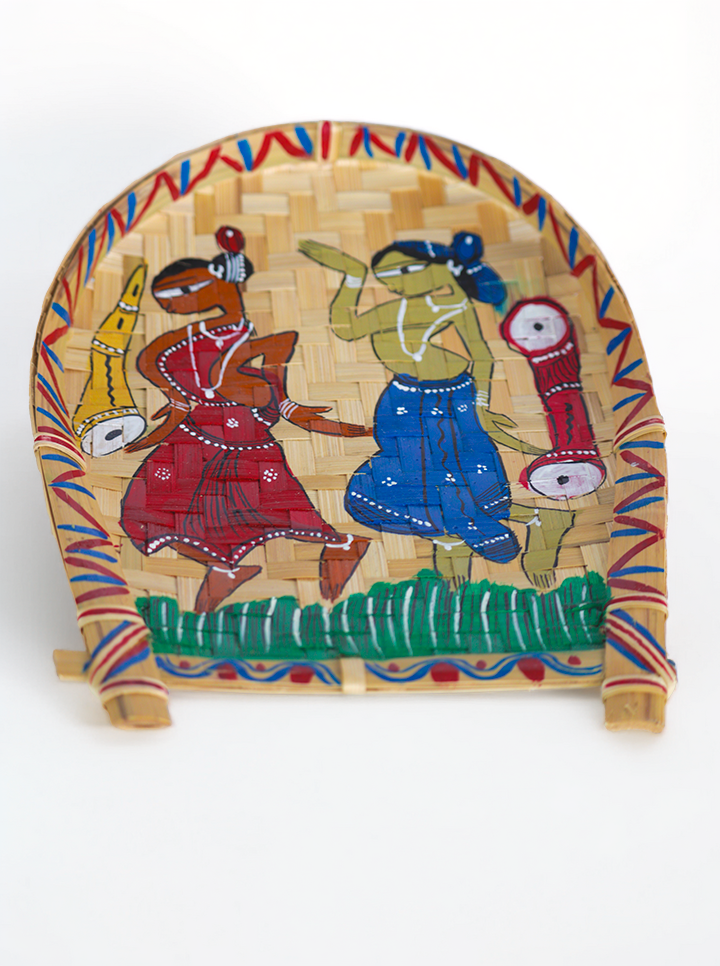 Bring the essence of traditional craftsmanship into your home with this hand-painted bamboo tray, featuring vibrant tribal folk art. Carefully handcrafted by skilled artisans, this piece showcases an intricate dance scene, reflecting India's rich cultural heritage. The natural woven bamboo background adds a rustic, earthy charm, making it a perfect addition to bohemian, ethnic, or traditional décor.