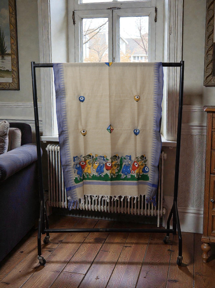 Celebrate tradition with this elegant handcrafted Bengal Pattachitra dupatta, featuring a vibrant Folk Dance artwork on a soft beige base.