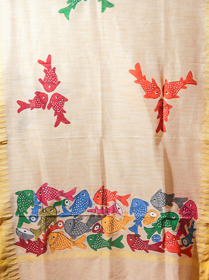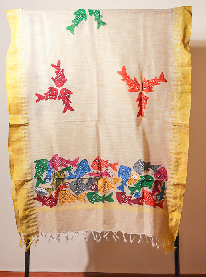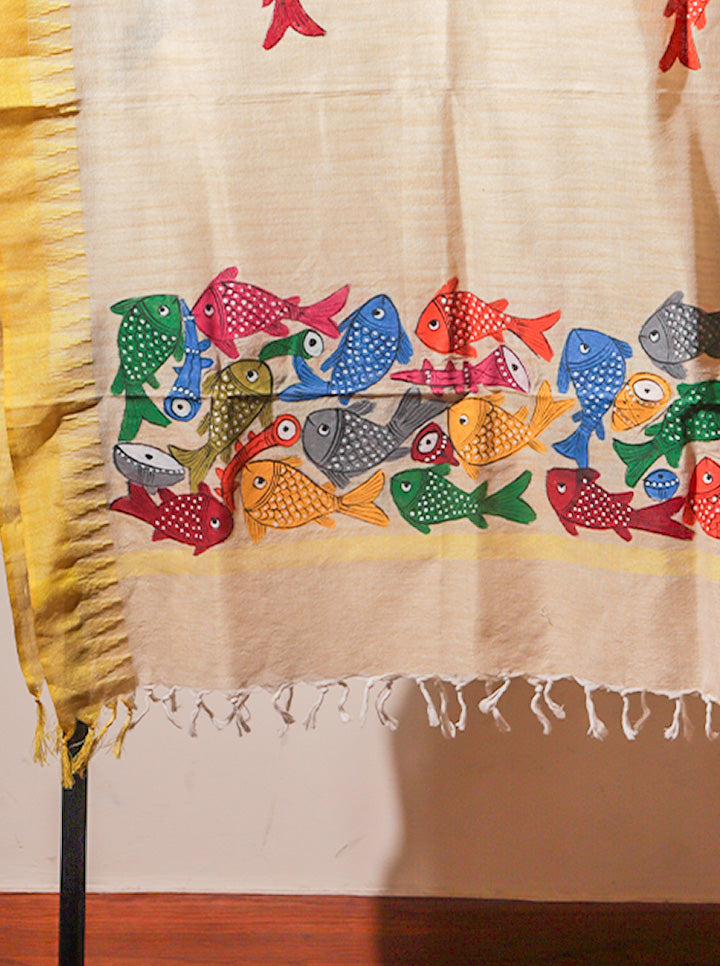 Elevate your wardrobe with this stunning handmade dupatta, adorned with intricate Pattachitra artwork from Bengal. Crafted on soft, breathable fabric, it features vibrant depictions of fish motif a symbol of prosperity. Perfect for pairing with ethnic or fusion outfits, this dupatta adds elegance and a touch of artistry to any look. Lightweight, versatile, and easy to drape, it’s an ideal choice for festive occasions or as a thoughtful gift for someone special.