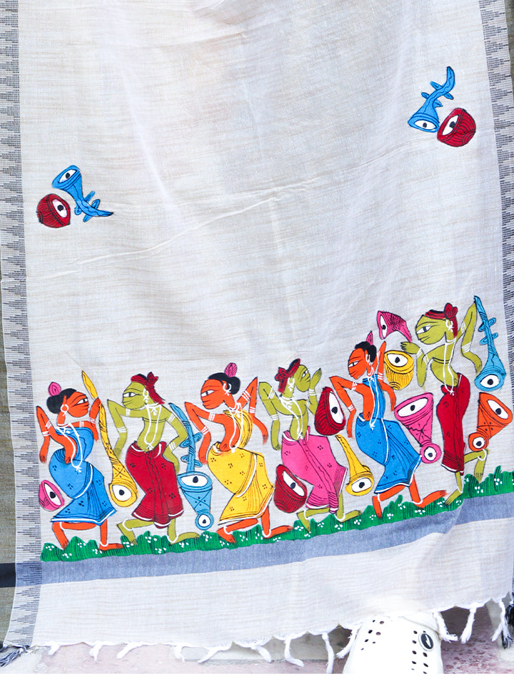 Celebrate the fusion of tradition and artistry with this exquisite hand-painted Pattachitra dupatta, featuring vibrant depictions of devotional dance and divine elements.