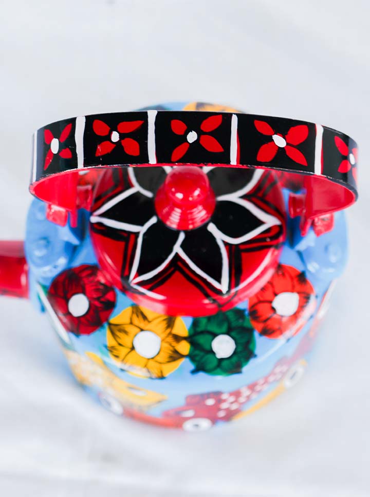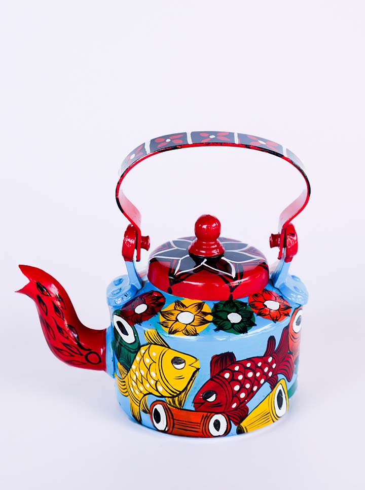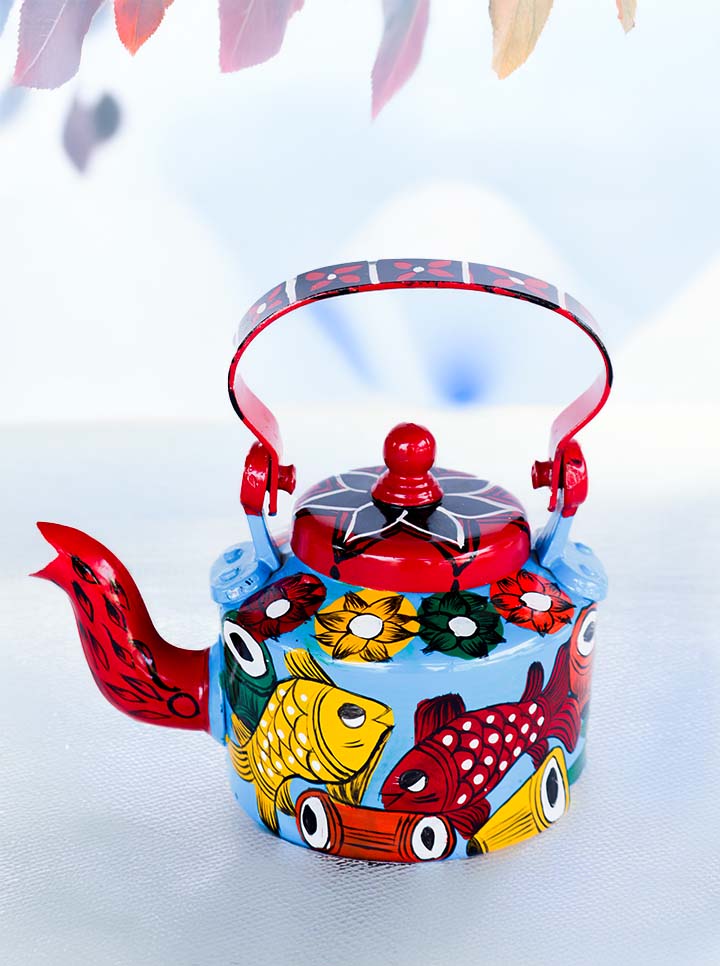 Hand-Painted Pattachitra Kettle – Fish Motif Folk Art (Blue And Maroon)