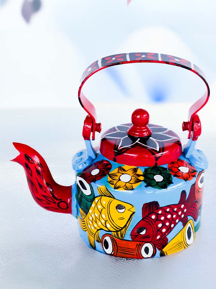 Immerse yourself in the beauty of traditional Indian craftsmanship with this hand-painted Pattachitra kettle, featuring vivid fish motifs inspired by Odisha’s ancient art form. A symbol of prosperity and good fortune, the fish design is artistically rendered with intricate detailing, making this kettle a stunning piece of functional art.
