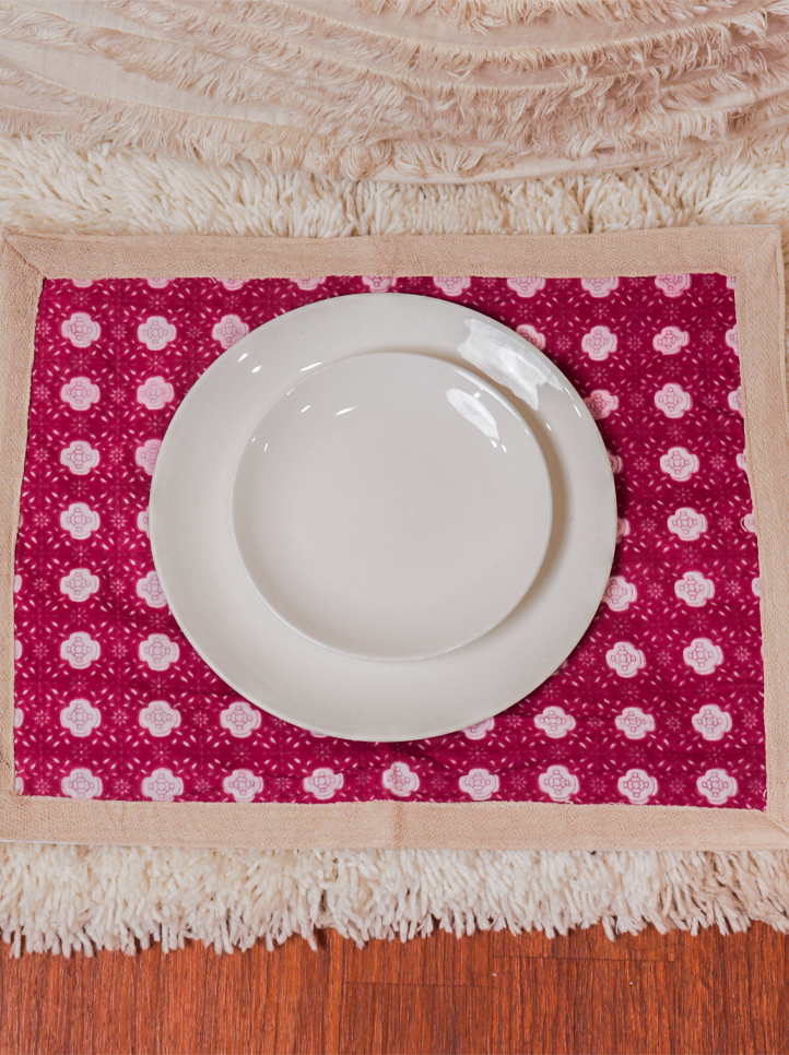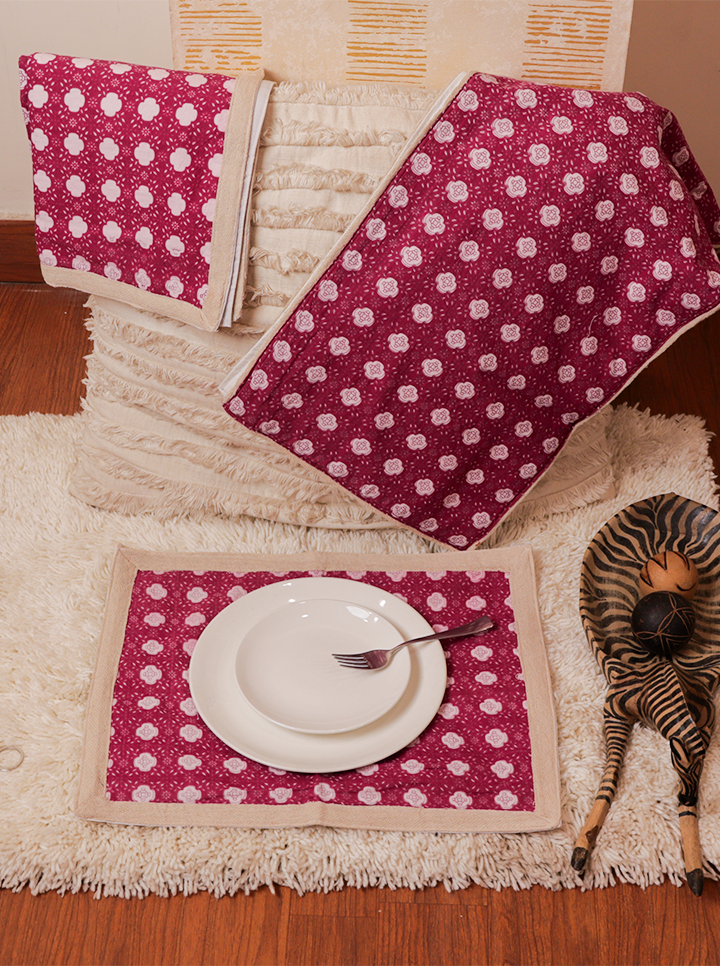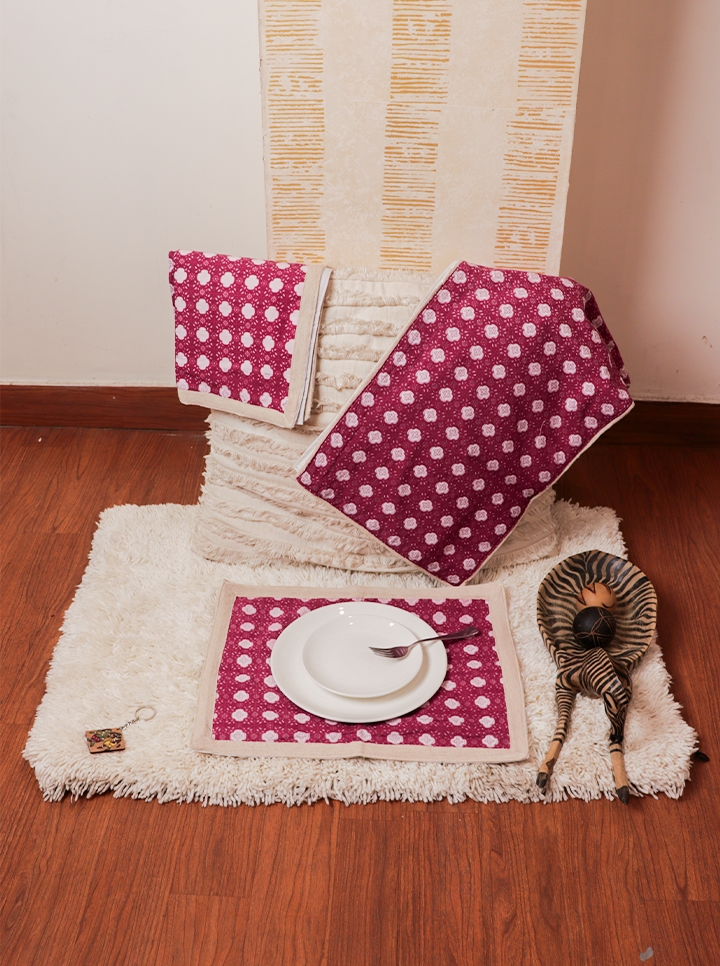 Elevate your dining experience with this vibrant handmade table mat set, adorned in deep maroon and playful white polka dots. Carefully crafted from soft cotton fabric, these mats bring warmth, character, and a hint of nostalgia to your table setting.