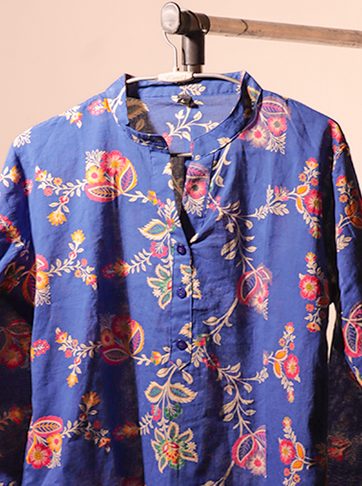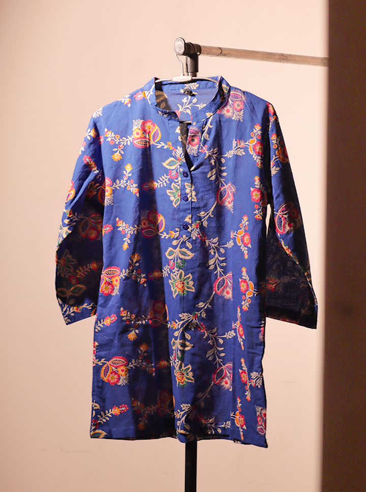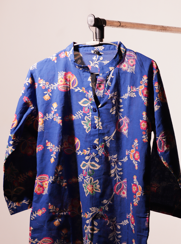 This deep indigo kurti- is a head-turner, fusing vibrant floral prints with a free-flowing silhouette that whispers effortless grace. Perfect for lovers of statement prints and comfortable elegance.