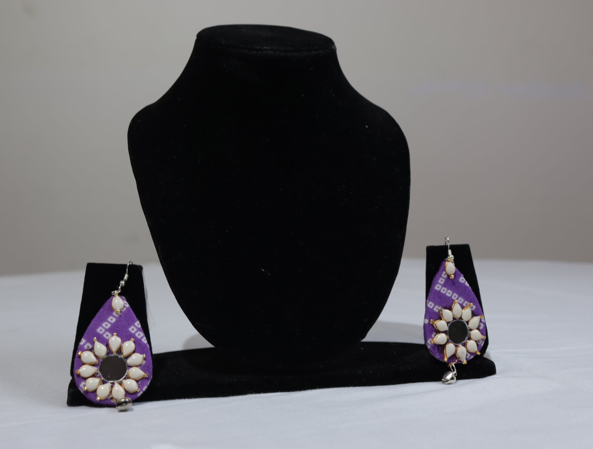 Elevate your festive and everyday ethnic style with these beautifully handcrafted purple teardrop earrings. Designed on a soft fabric base with subtle traditional patterns, each piece features a striking round mirror centerpiece surrounded by elegant white drop beads, giving it a blooming-flower look.