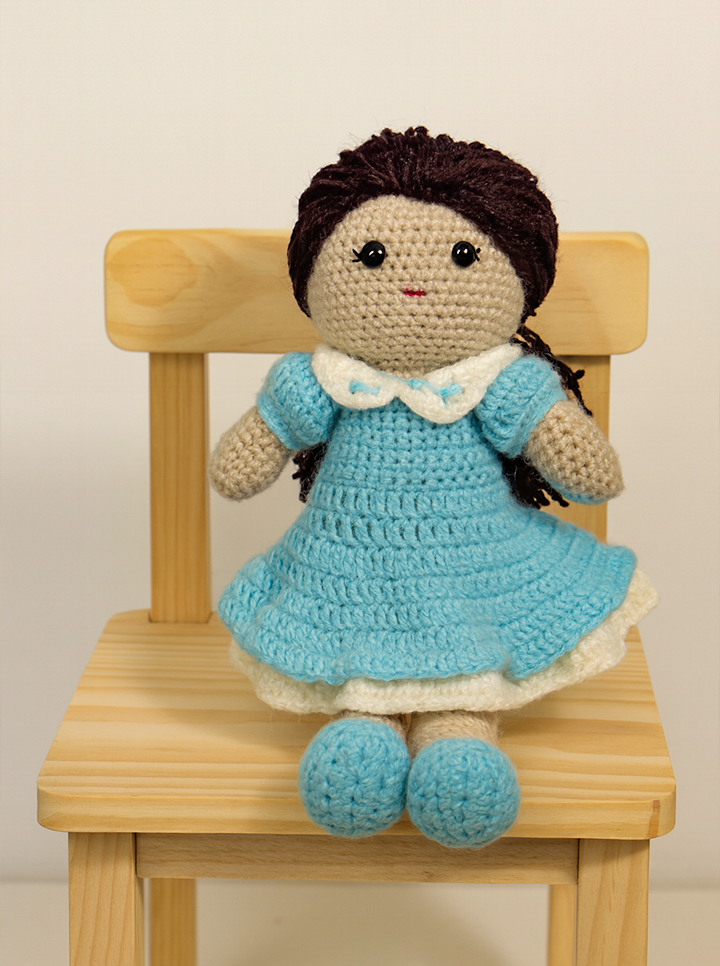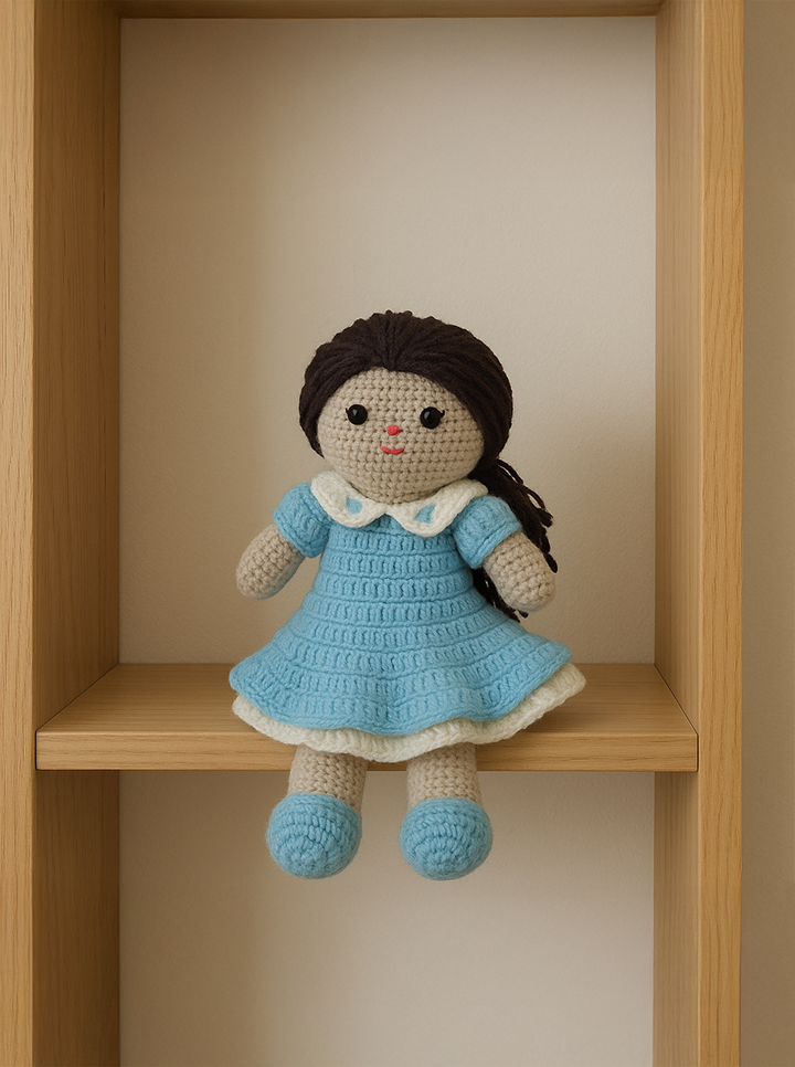 Meet your little one’s new best friend! This adorable crochet doll, dressed in a charming sky-blue frock with a white collar and hemline, is lovingly handcrafted to bring warmth, comfort, and endless smiles.