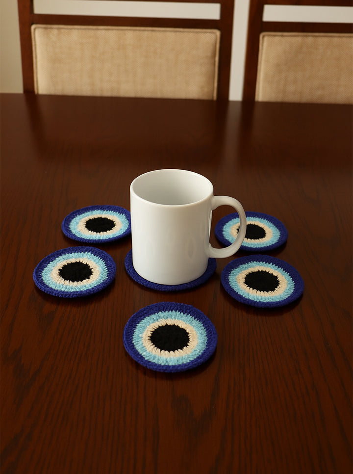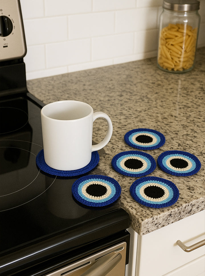 Handmade Crochet Evil Eye Coaster Set – 6 pcs