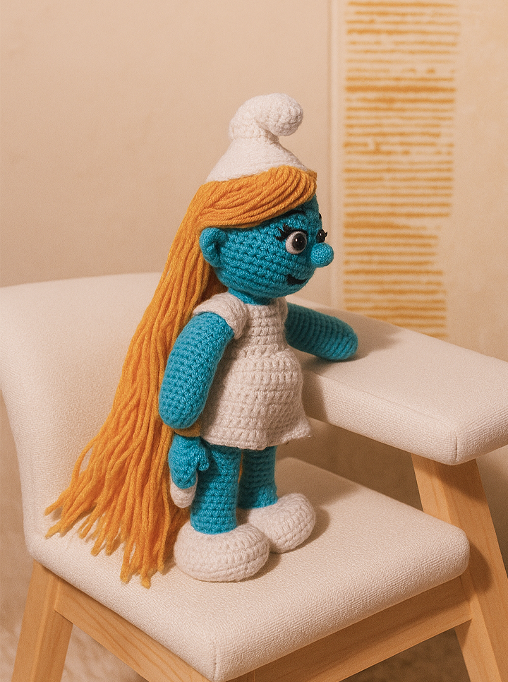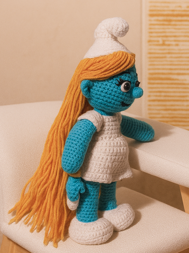 Bring a touch of nostalgia and charm into your home with this adorable handmade crochet Smurfette doll! With her signature blue skin, long golden locks, and white dress and hat, she’s ready for endless cuddles and imaginative adventures.