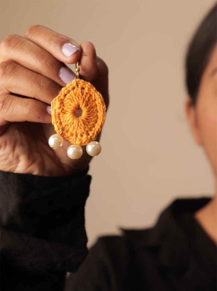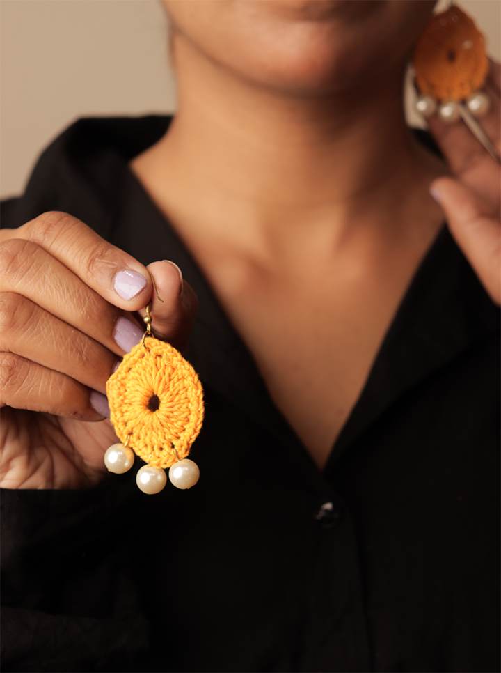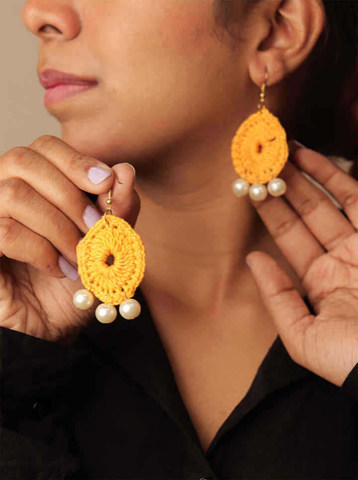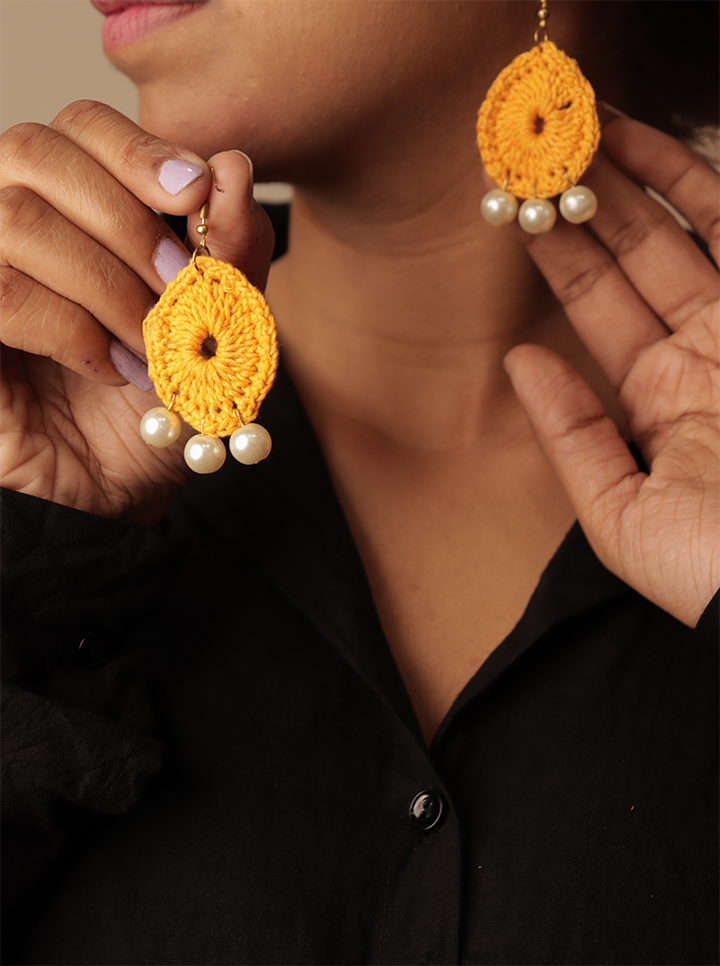Enhance your style with these Handmade Dark Yellow Crochet Earrings, beautifully crafted with intricate crochet work and adorned with delicate pearls. The deep yellow hue adds warmth and sophistication, while the pearl detailing brings a touch of timeless grace.