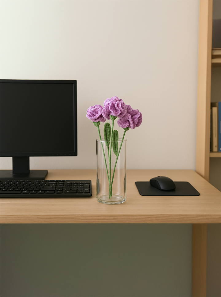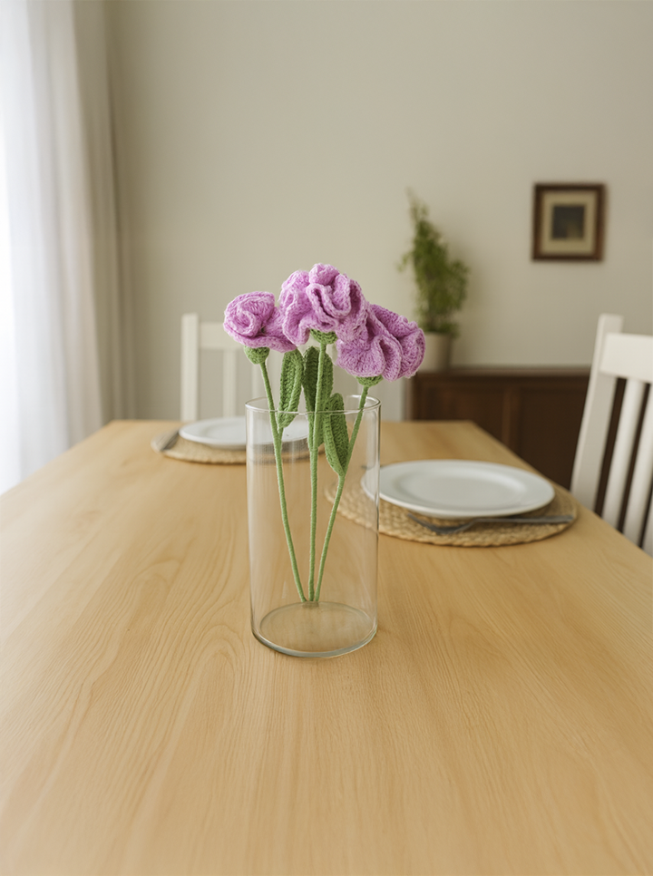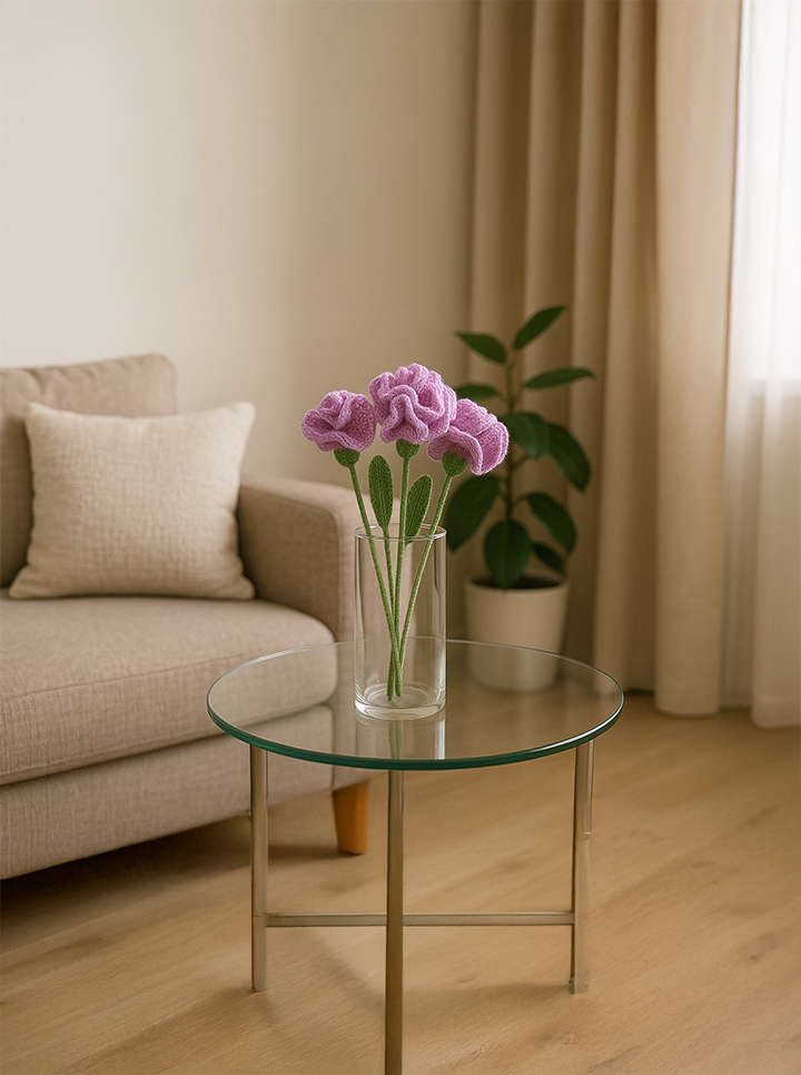 Bring everlasting beauty into your life with this handmade crochet carnation flower in a soft light purple shade. Carefully crafted with fine, durable yarn, this delicate bloom captures the charm of real carnations while lasting forever. Perfect as a keepsake, décor accent, or a thoughtful handmade gift, it adds a touch of elegance to any space.