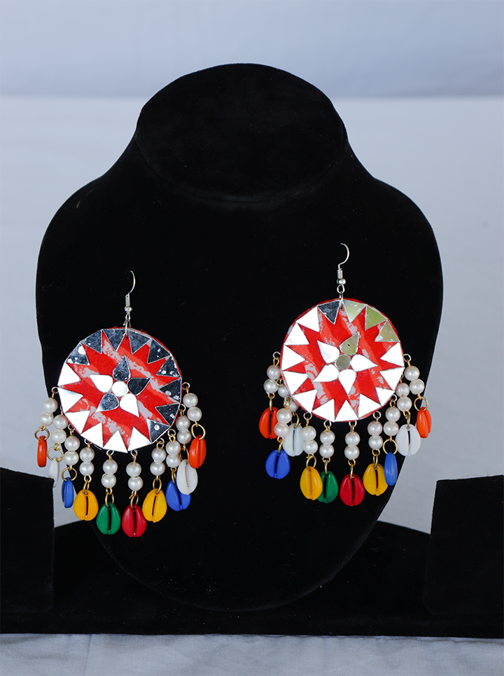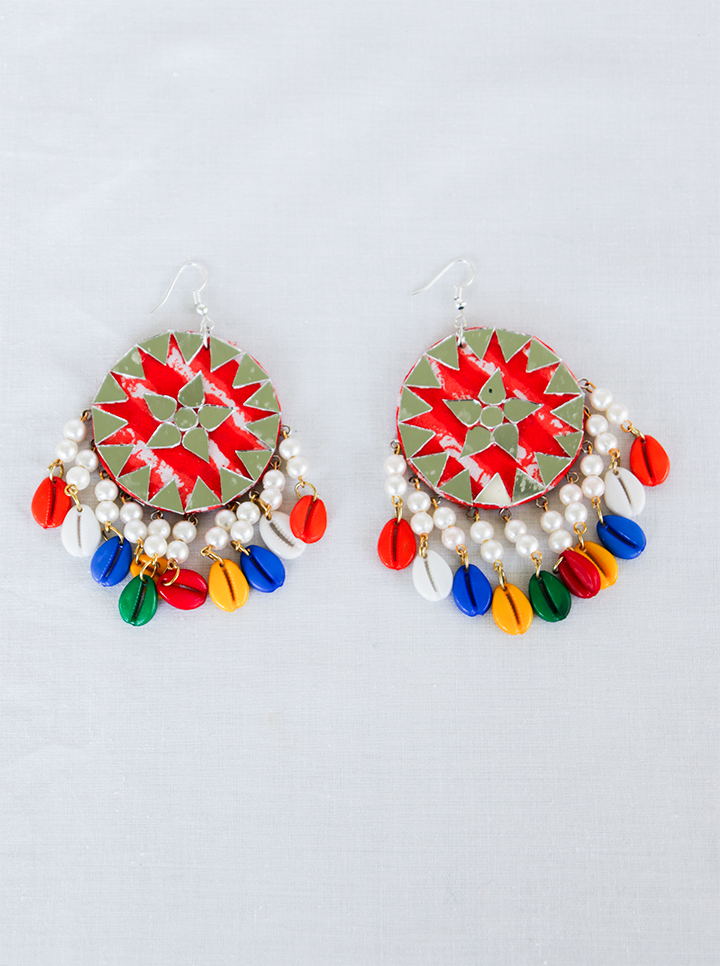 These vibrant handmade earrings are a perfect blend of tradition and modern artistry. Designed with intricate mirror work, elegant pearls, and colorful cowrie shells, they add a bold and stylish touch to any outfit.