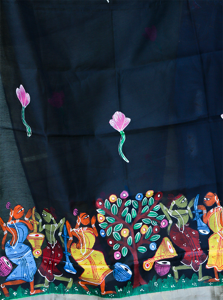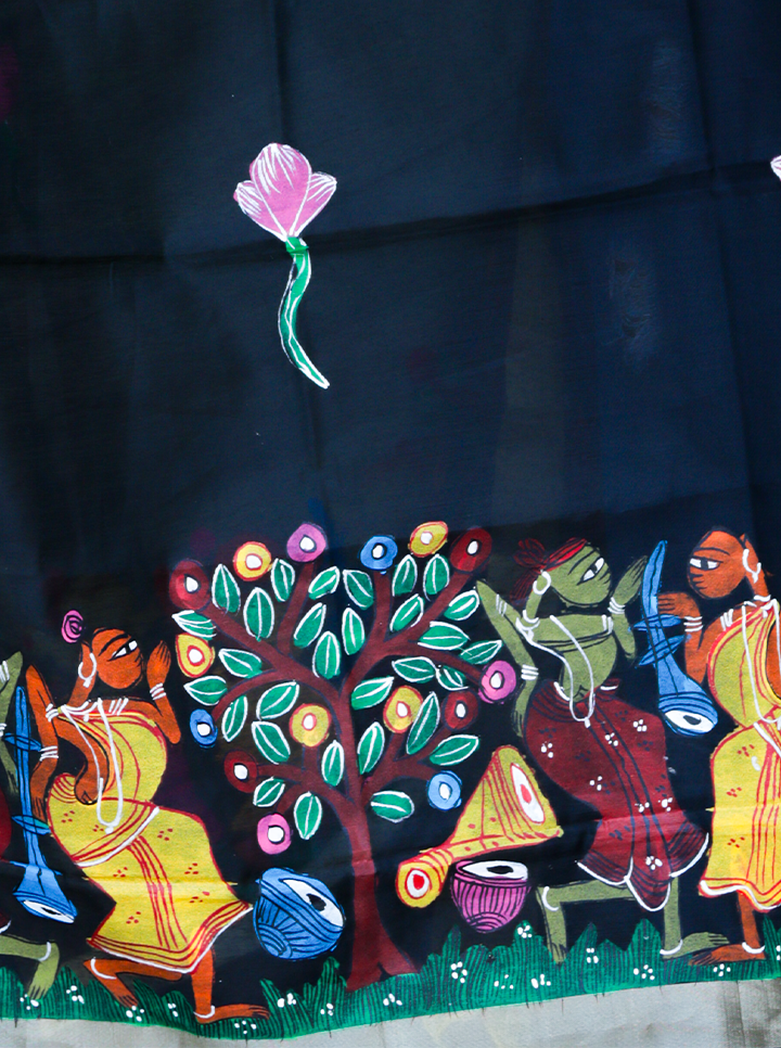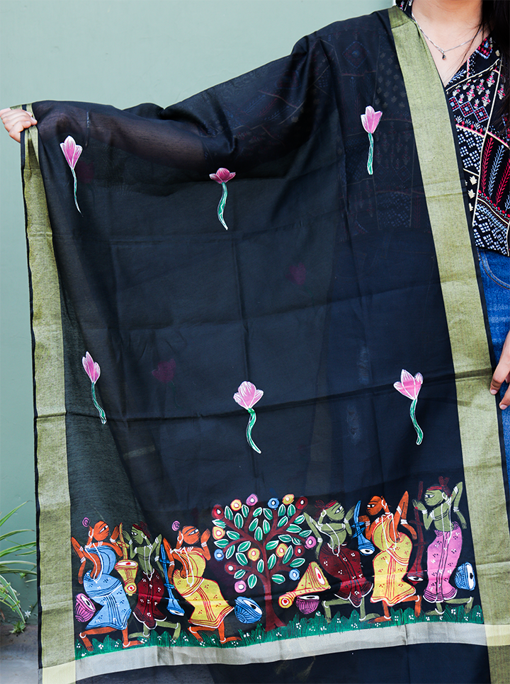 Embrace elegance with this striking black handmade dupatta, featuring exquisite Pattachitra artwork created by the Bengal School of Art. The intricate hand-painted motifs of vibrant folk dancers and musical elements stand out beautifully against the deep black fabric, accentuated by luxurious golden borders. Perfect for elevating your ethnic or festive outfits, this dupatta is a seamless blend of tradition and sophistication. Lightweight, versatile, and easy to style, it also makes a thoughtful gift for those who appreciate cultural artistry and timeless fashion.