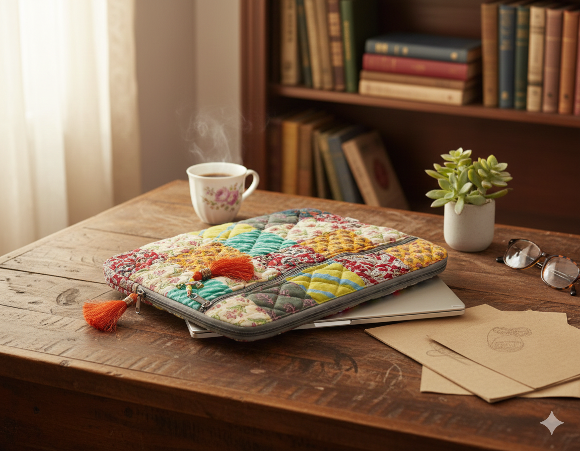 Crafted with care, this handmade laptop cover features a beautiful quilted patchwork design made from high-quality cotton fabric. The padded structure offers reliable protection against minor bumps and scratches, while the smooth zip closure ensures your laptop stays safe and secure. Finished with handcrafted tassel detailing, this cover brings together comfort, functionality, and artisanal charm—perfect for everyday work, travel, or thoughtful gifting.