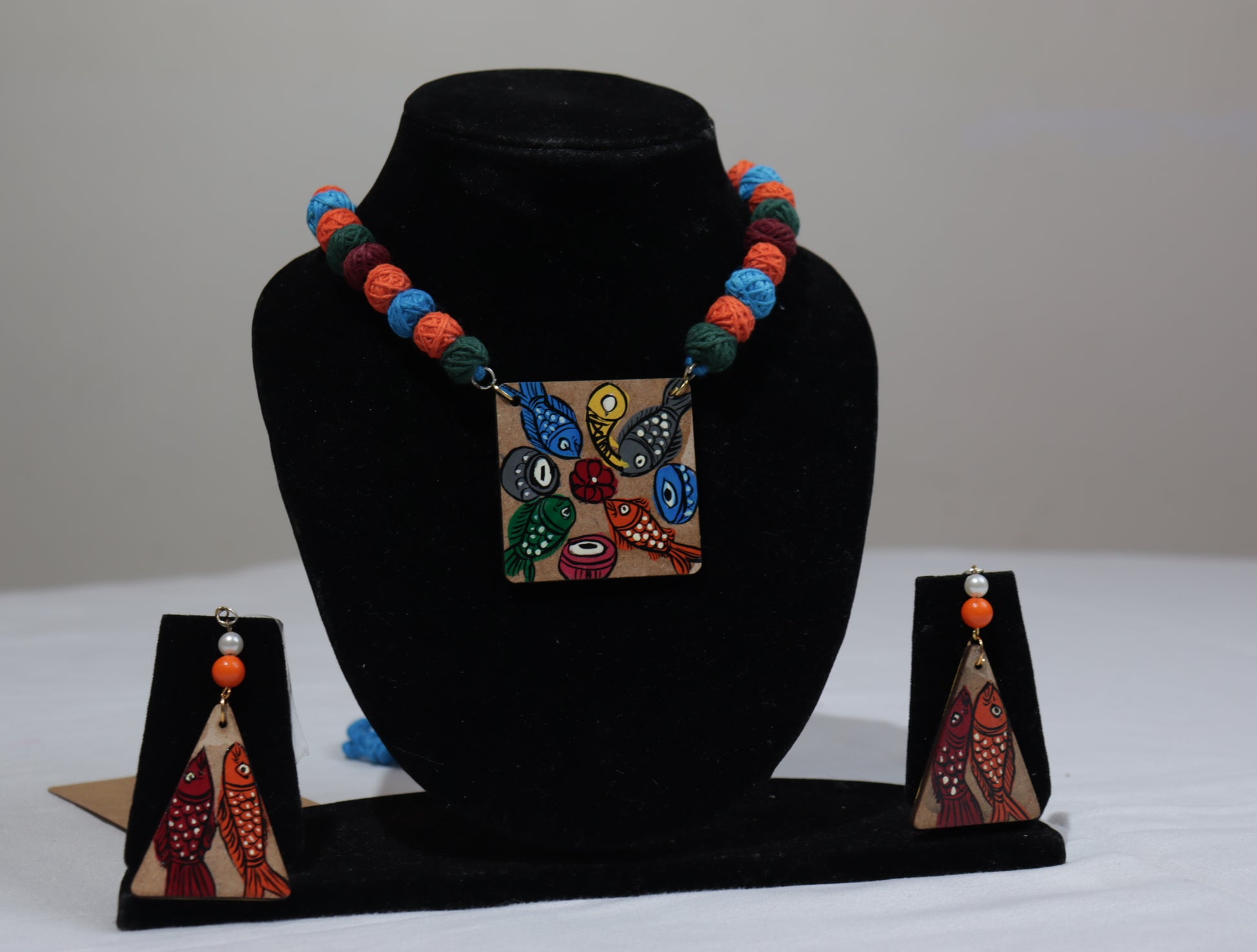 Handpainted Pattachitra Style Fish Art Necklace Set | Multicolor Thread Beads | Handmade Tribal Jewelry