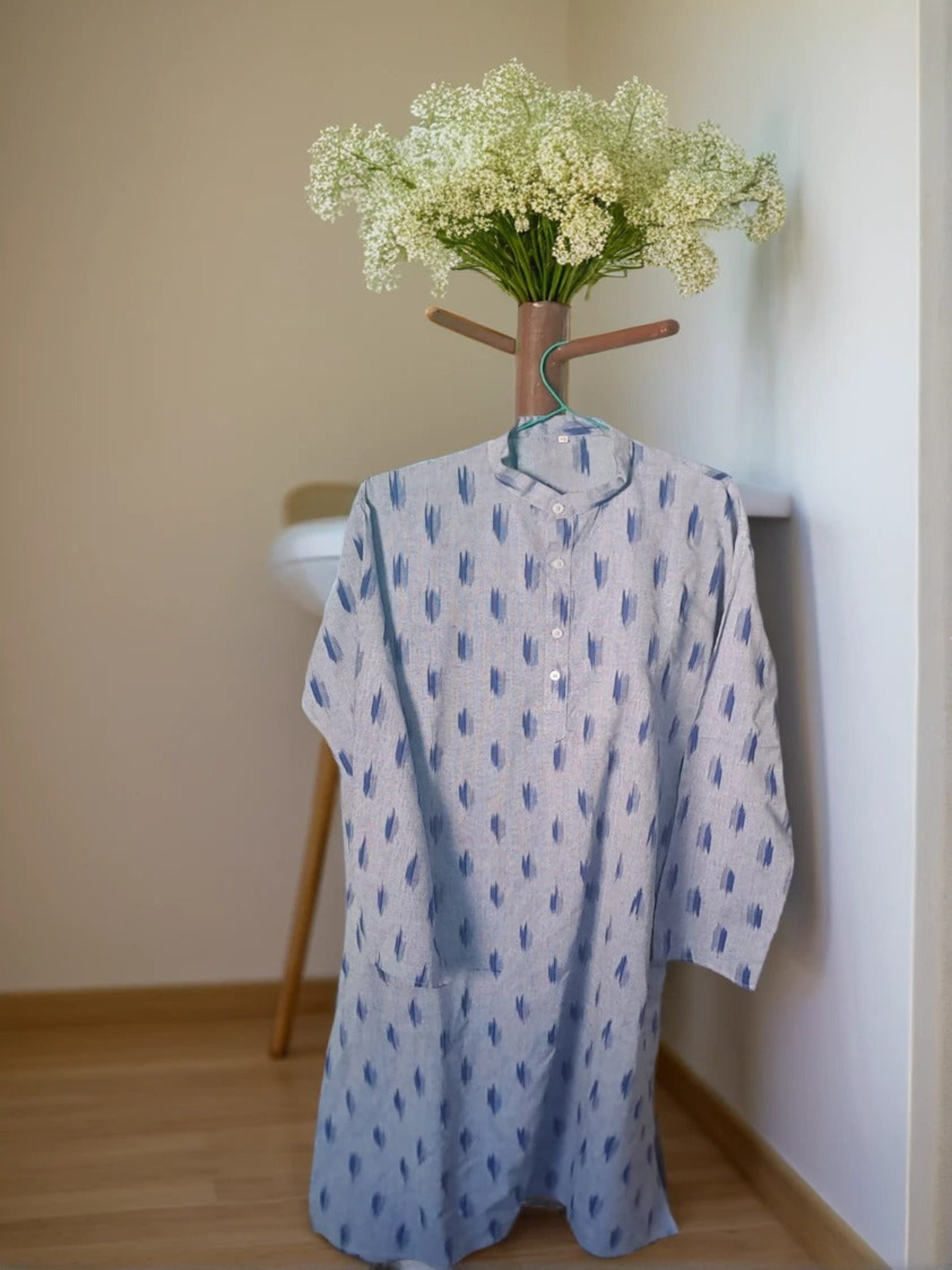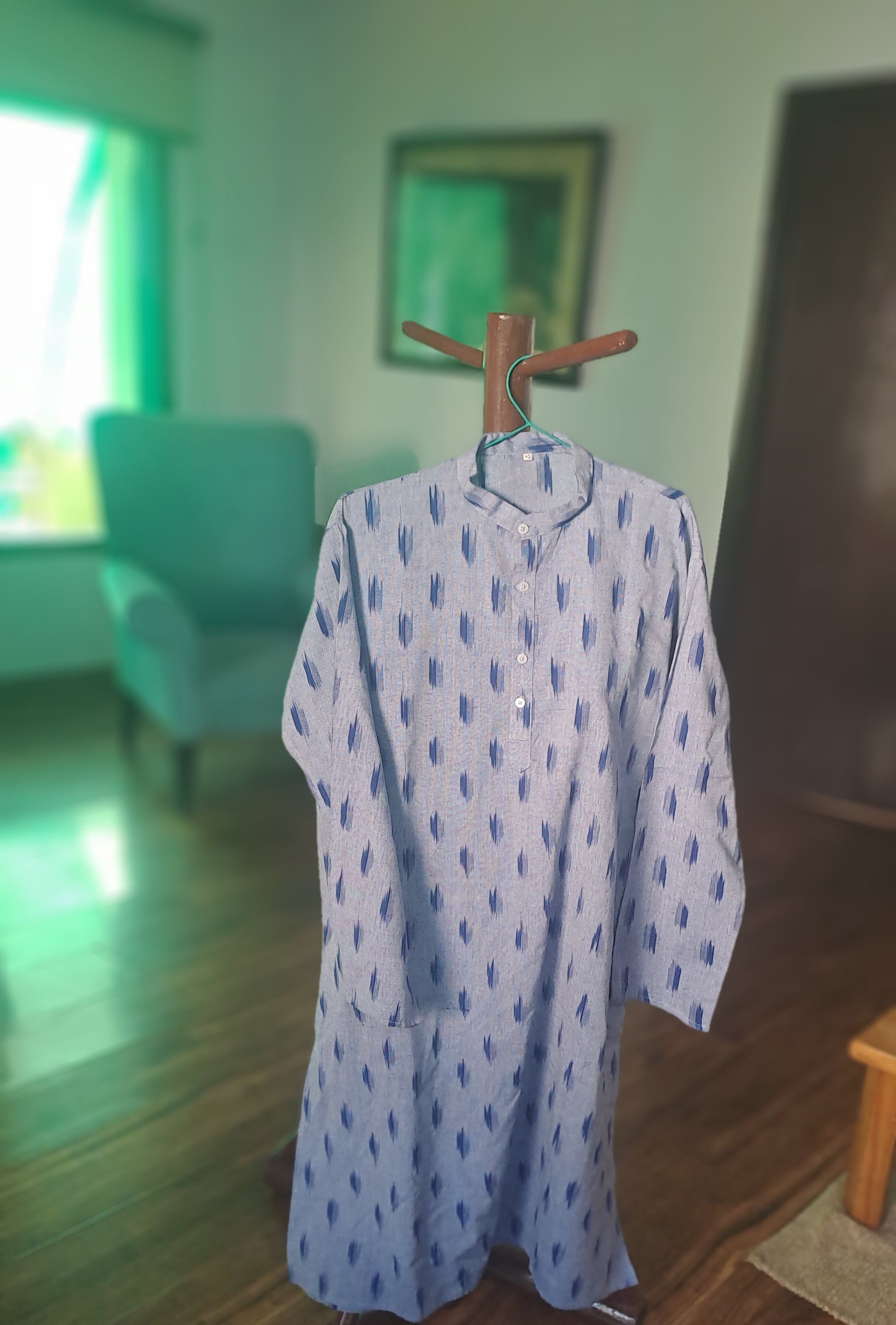 Elevate your wardrobe with this Ikat Cotton Kurta, a perfect blend of tradition and comfort. Crafted from premium-quality handwoven cotton, this kurta features the distinctive Ikat weaving technique, where threads are dyed before weaving to create beautiful, blurred patterns.
