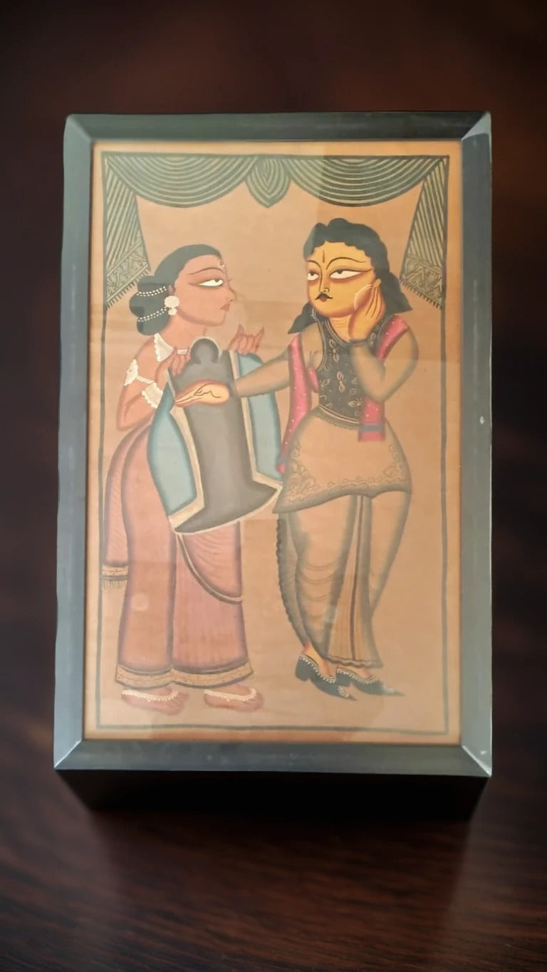 This is an original Kalighat painting, a traditional art form from the Bengal School of Art, created by a Chitrakar family from Medinipur, Bengal. Kalighat paintings emerged in the 19th century around the famous Kalighat temple in Kolkata and are known for their bold lines, rich colors, and depictions of mythological, social, and religious themes.