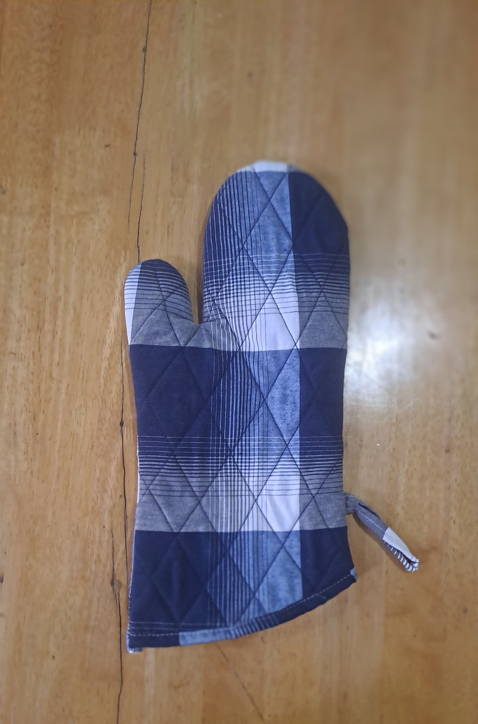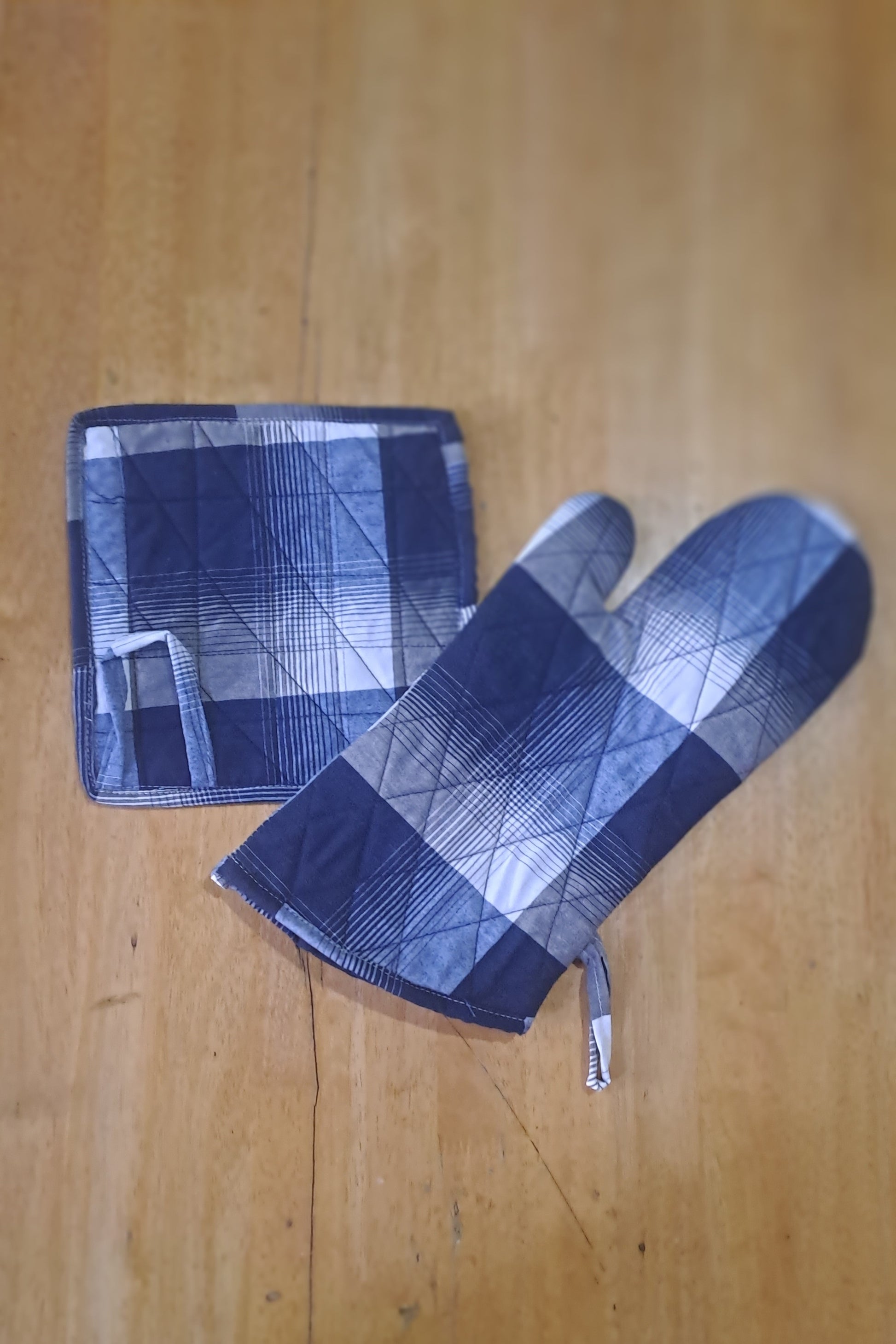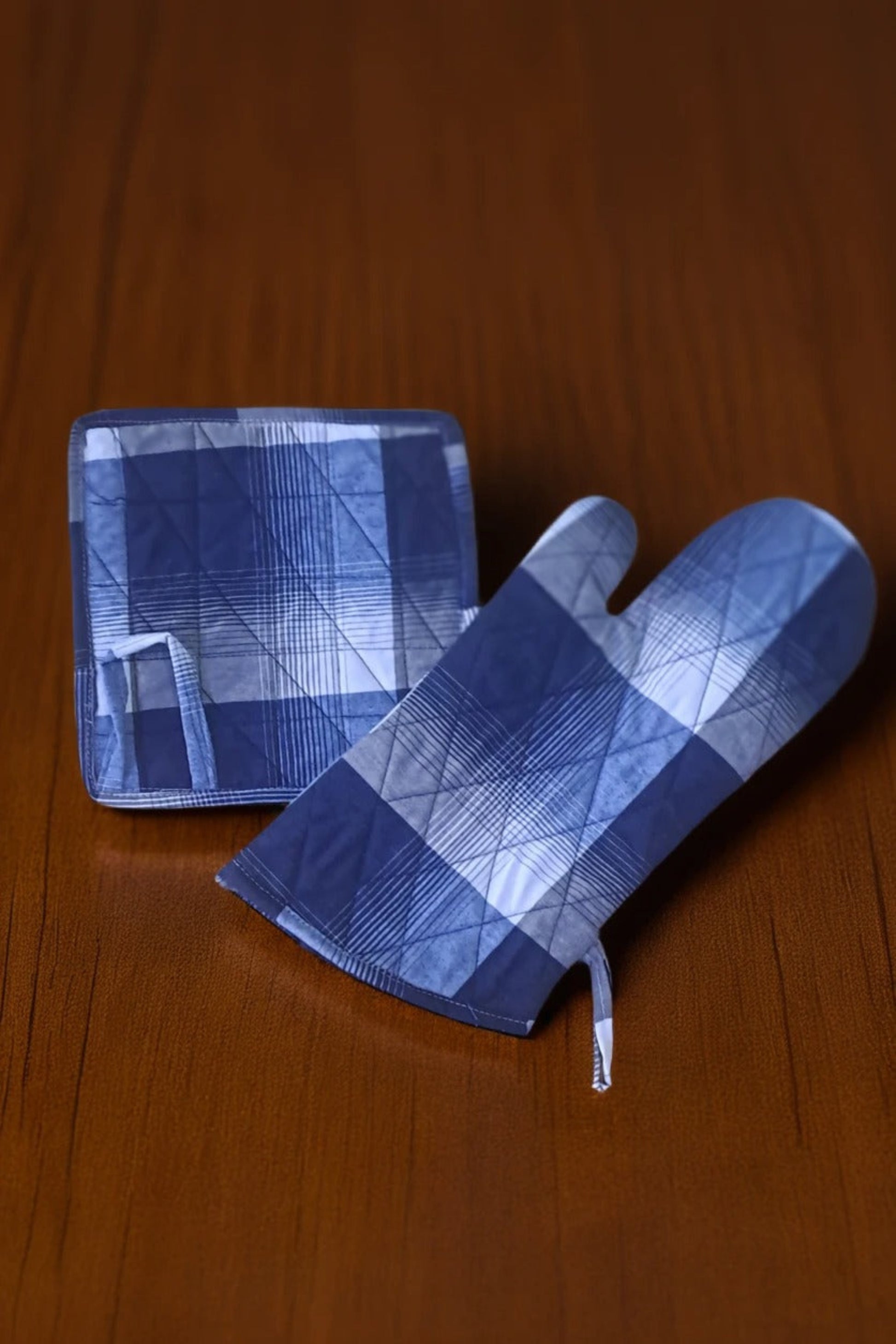 Protect your hands while cooking with this high-quality oven glove and pot holder set. Featuring a stylish blue plaid design, this set is made from durable, heat-resistant fabric with quilted stitching for added safety. The glove offers a comfortable fit for secure handling of hot cookware, while the pot holder doubles as a heat-resistant mat. Both pieces include hanging loops for easy storage. Ideal for baking, grilling, and everyday kitchen use.