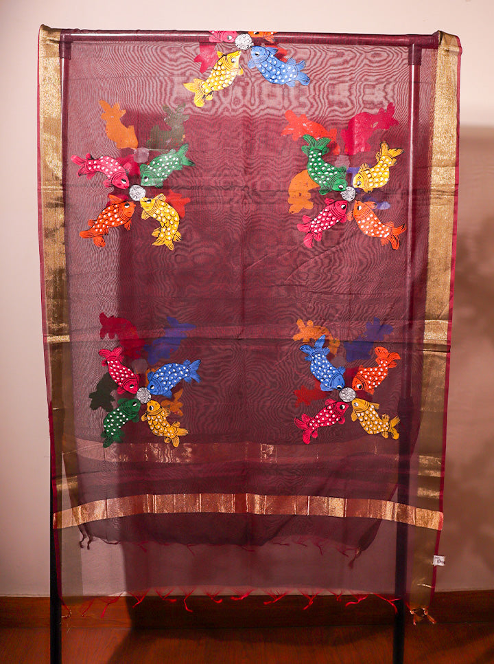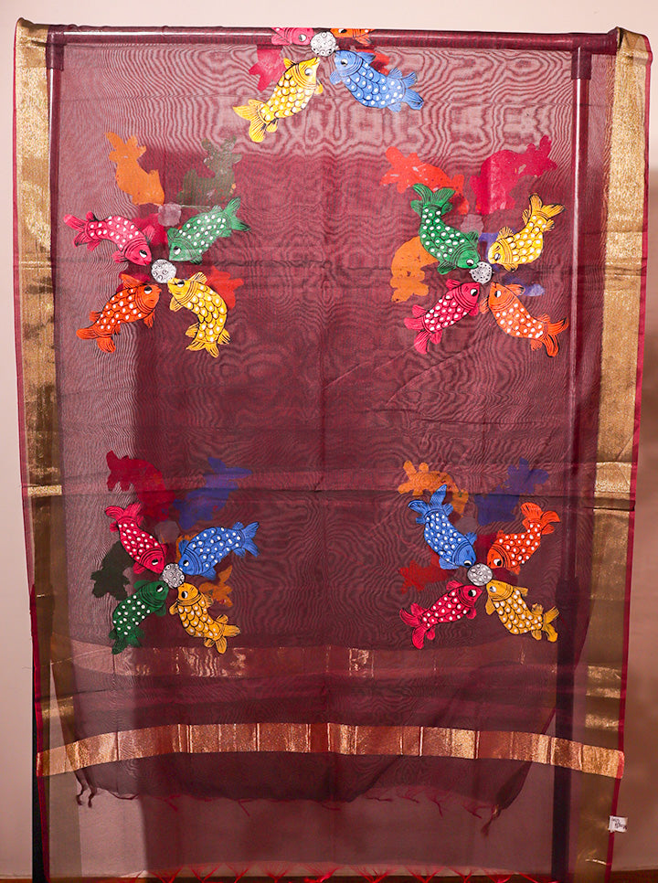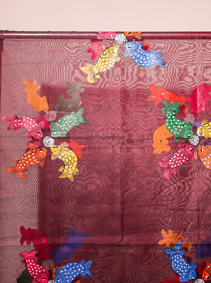 Pattachitra Handpainted Dupatta – Maroon | Fish Motif Elegance