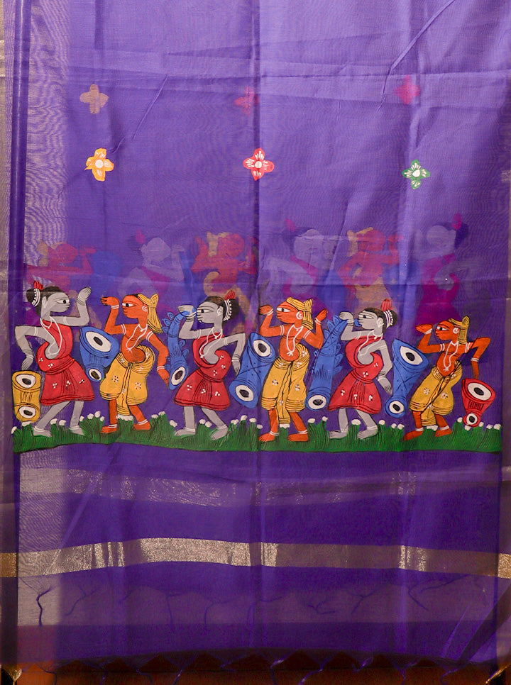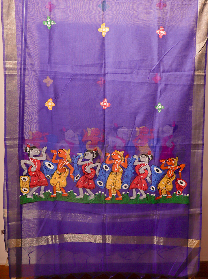 A Canvas of Culture and Craftsmanship Drape yourself in tradition with this exquisite royal blue dupatta featuring intricate Pattachitra artwork, an ancient storytelling art form from Odisha. Handpainted with divine precision, it depicts a vibrant procession of musicians and dancers, celebrating Indian folklore in every stroke. Features: Fabric: Fine, lightweight cotton or silk blend (as per actual) Art: Traditional Pattachitra handpainting Color: Royal Blue with multicolor figures and silver zari borders Border: Elegant silver weave on all sides Highlights: Each piece is handcrafted by skilled artisans Depicts folk art motifs — perfect for festive, cultural, or statement styling A collector’s piece for lovers of Indian heritage Ideal for: Gifting, festive wear, temple visits, or styling with solid kurtas and sarees Elevate your ethnic wardrobe with a masterpiece that blends heritage, color, and charm — one brushstroke at a time.