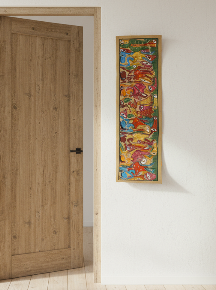 Celebrate the richness of Indian heritage with this Tribal Art Pattachitra Painting, crafted in the traditional style of the Bengal School of Art. The artwork features vibrant colors, intricate patterns, and tribal motifs that tell timeless cultural stories. Perfect to enhance your home décor, art collection, or as a thoughtful gift.